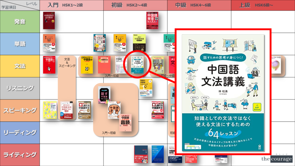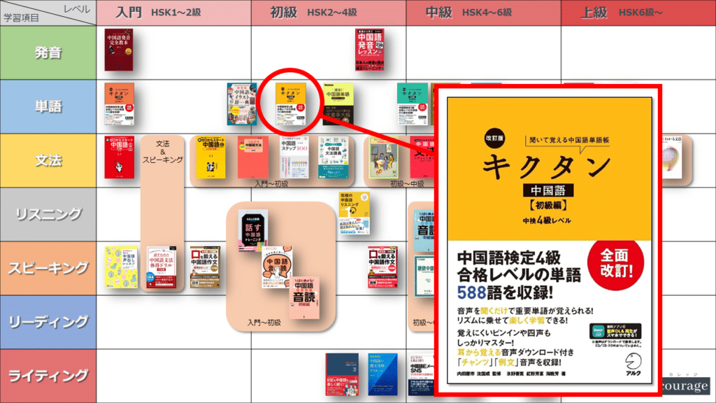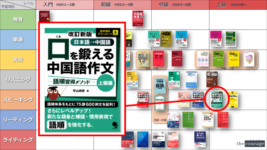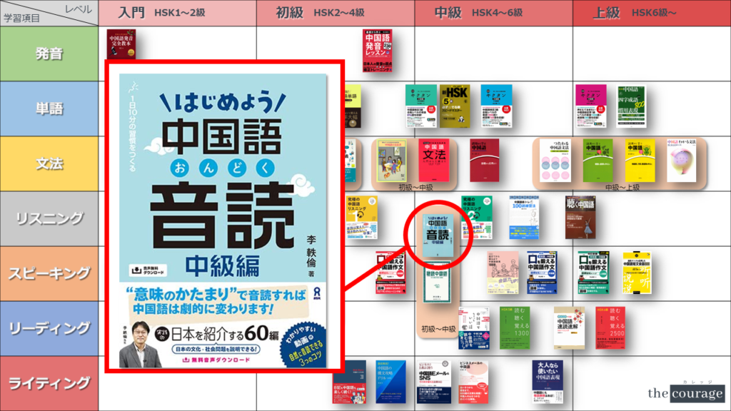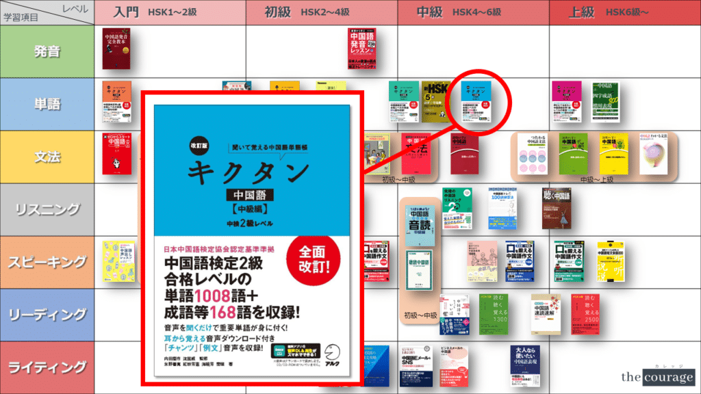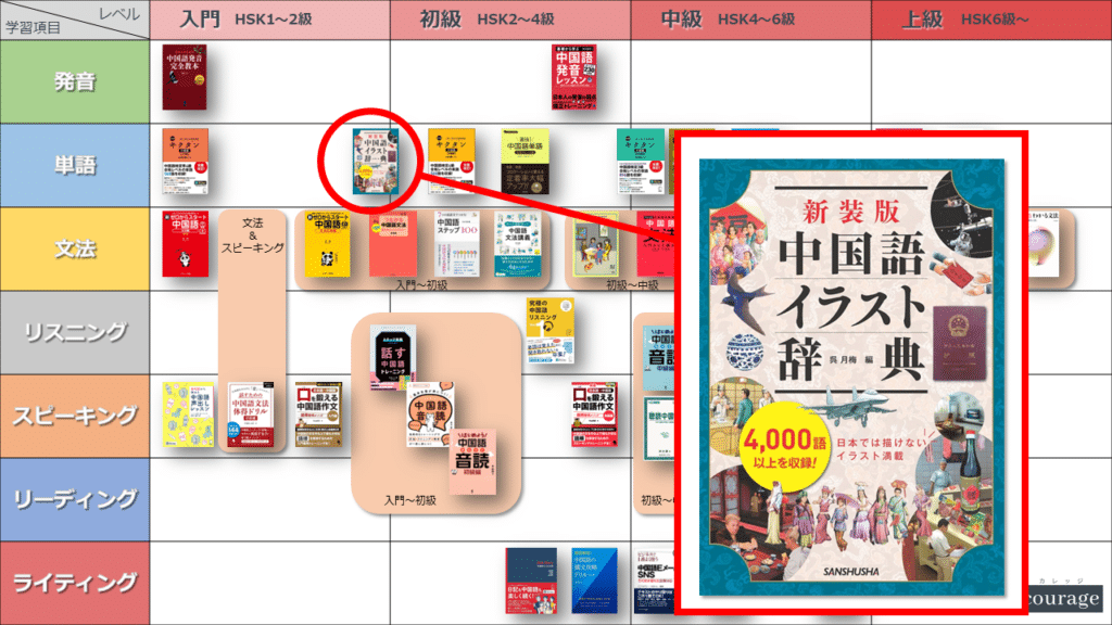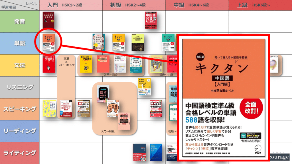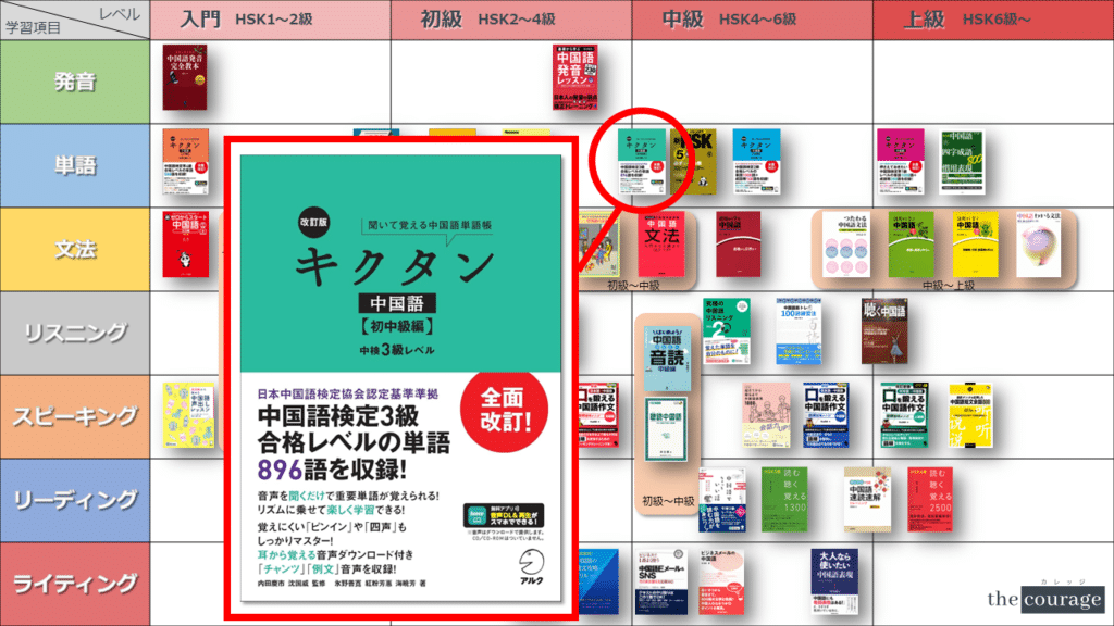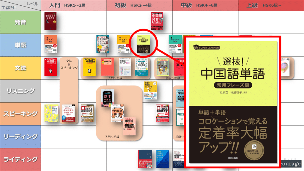 中国語学習者から「おすすめのテキスト、参考書を教えてください!」と相談を受けることが多いので、みなさんに役立つよう、パート別・レベル別の中国語学習のおすすめ参考書マップを作成しています。(毎年更新:2022年版、2023年版、2024年版、2025年版)