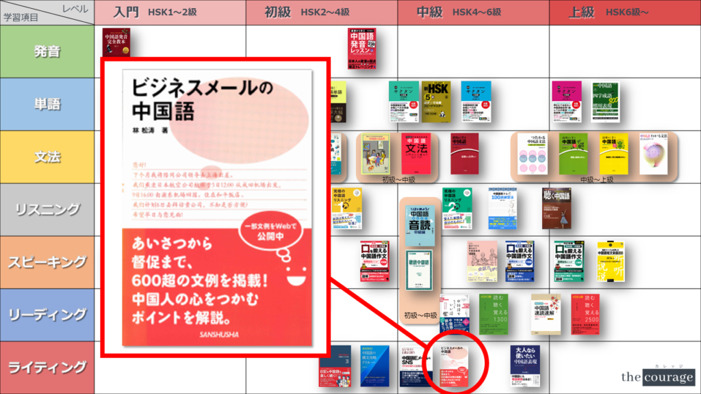 ビジネスメールを作成する時「日本語ではこういうフレーズを入れるけど、中国語ではどうするんだろう?」という疑問が出てきたりしますが、そうした時にこのテキストに目を通しておくと解決できることが多いです。こちらもライティングの中でも、ビジネスメールを送る必要があるという方におすすめの1冊です。ピンイン表記が無いので、ピンインの知識がある程度身についている方向けです。